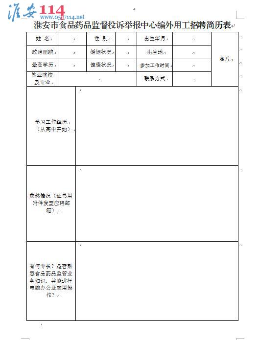 附件:淮安市食品藥品監(jiān)督投訴舉報中心編外用工招聘簡歷表.doc