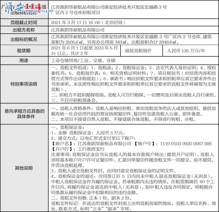 江蘇淮陰華新紙品有限公司倉庫面向社會公開招租